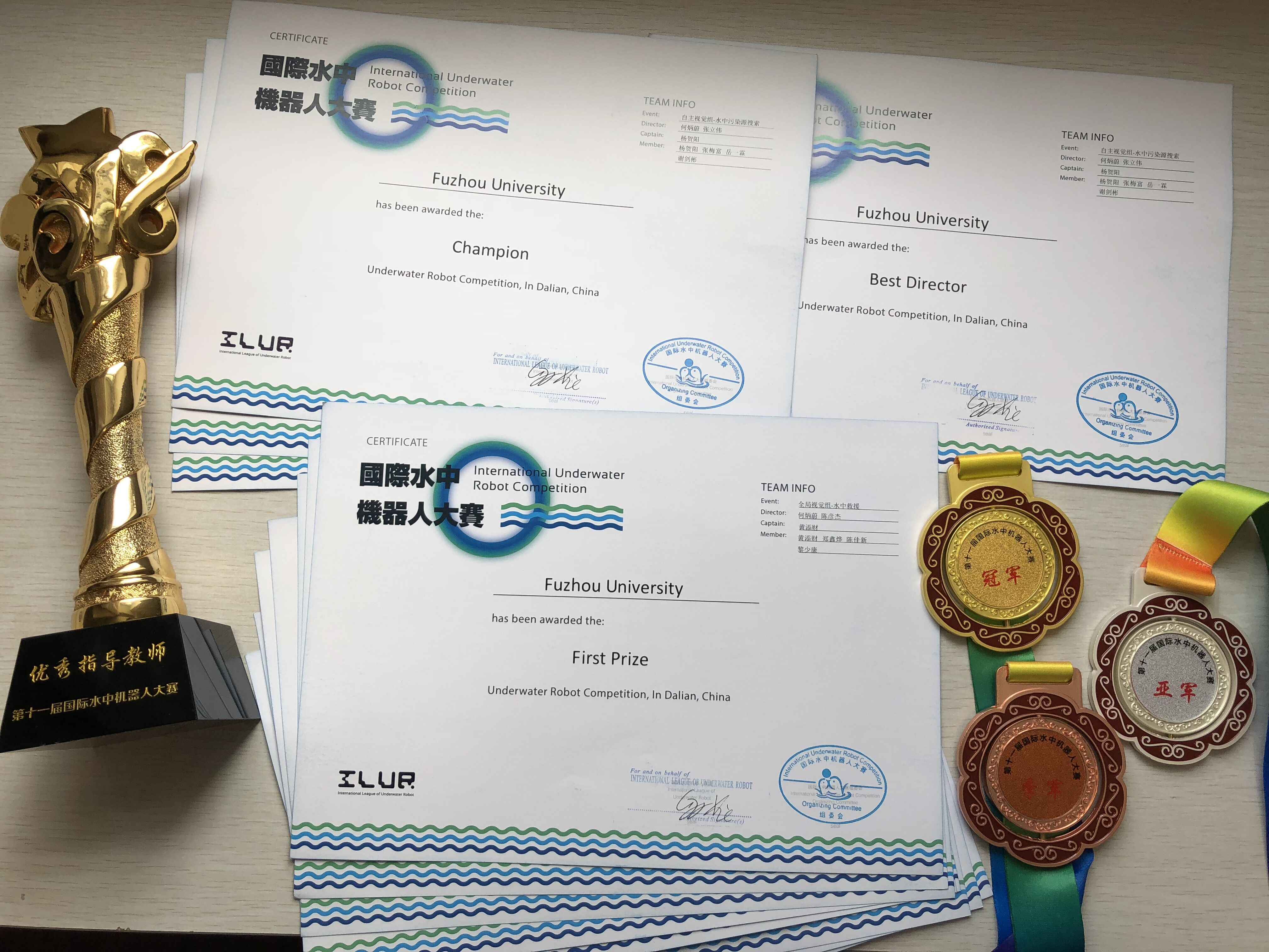 水中机器人代表队共获得大赛一等奖3项、二等奖1项以及三等奖4项。创历史最好成绩。其中何炳蔚教授和张立伟副教授指导的杨贺阳、张梅富、岳一霖和谢剑彬四位本科生获得大赛“水中污染源搜索”科目的冠军。由张立伟副教授和林立雄博士指导的李欢、庄彬荣、蔡坤彬、汪泽玮和谢洁瑜五位本科生获得大赛“港口侦查”科目的亚军。由何炳蔚教授和陈彦杰博士指导的黄添财、郑烨鑫、陈佳新和黎少康四位本科生获得大赛全局视觉组“水中救援”科目的季军。何炳蔚教授、张立伟副教授分别荣获本场赛事的优秀指导教师。