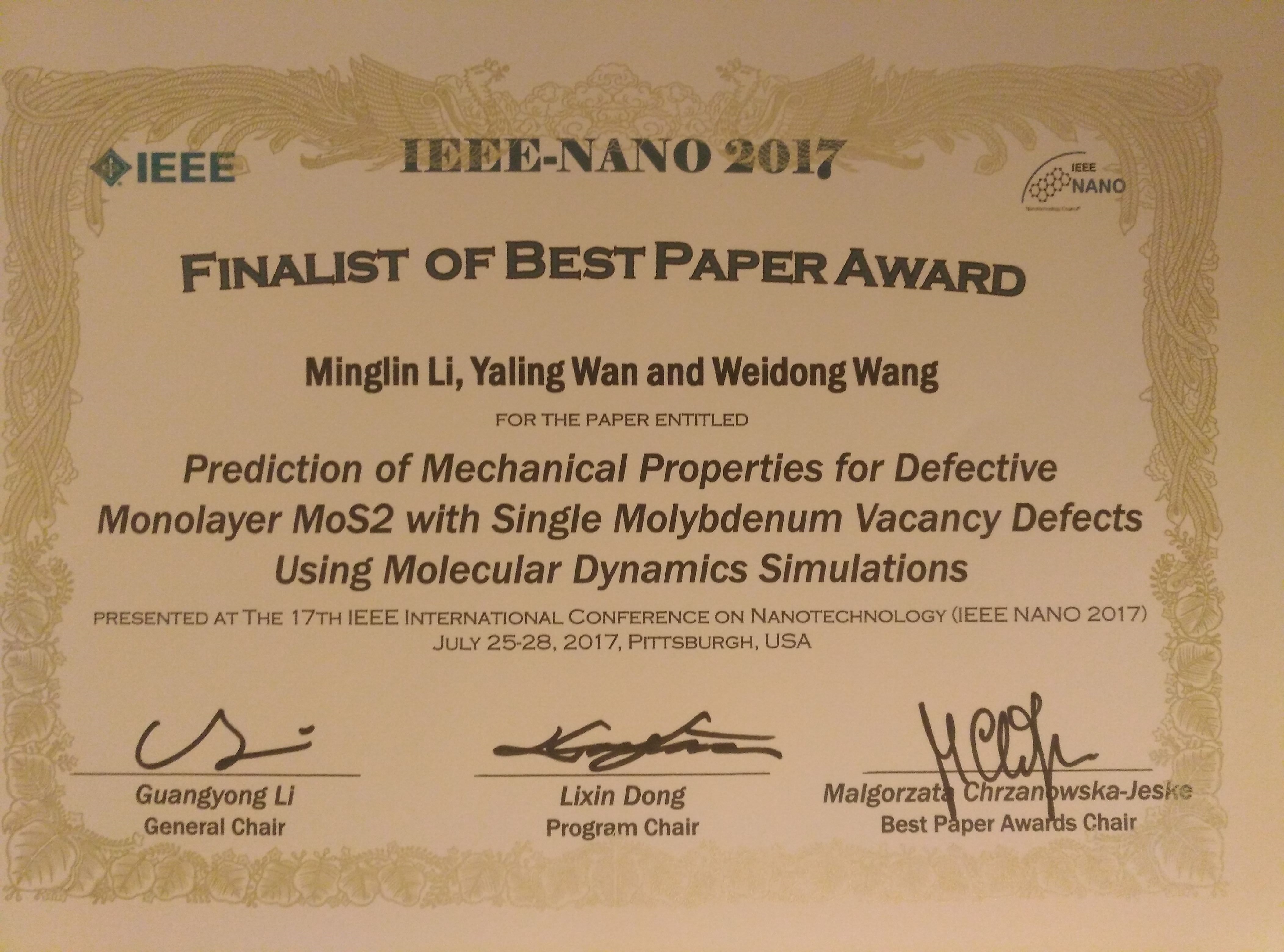李明林副教授小组论文“Prediction of Mechanical Properties for Defective Monolayer MoS2 with Single Molybdenum Vacancy defects Using Molecular Dynamics Simulations”获得本届大会最佳论文提名奖(Final Paper List)的殊荣,这是我校乃至中国大陆首次获得该系列国际会议最佳论文提名奖。论文第一作者兼通讯作者为李明林副教授,第二作者为我校2017届优秀硕士毕业研究生万亚玲同学,另一合作通讯作者为西安电子科技大学王卫东教授。
