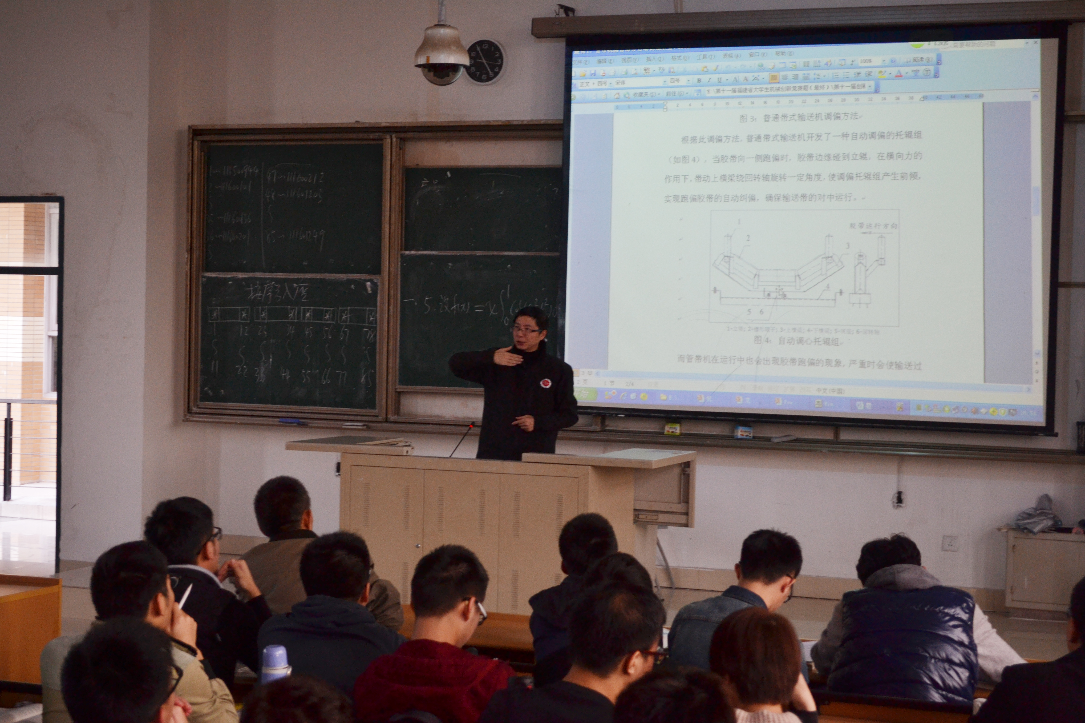 此次活动由滕培秀辅导员主持。活动中,刘晓敏教授先为大家介绍了大学生机械创新大赛的基本情况以及我校所取得的历史成就,并根据往年比赛学生出现的问题提出了一些注意事项和建议。接着,朱光宇教授针对某些同学参赛中不负责任的行为提出了批评,并呼吁大家用严谨负责的态度参赛。最后,由陈绍春教授以题目、图片、视频的形式为大家解读题目,增强同学对机械创新竞赛的认识。