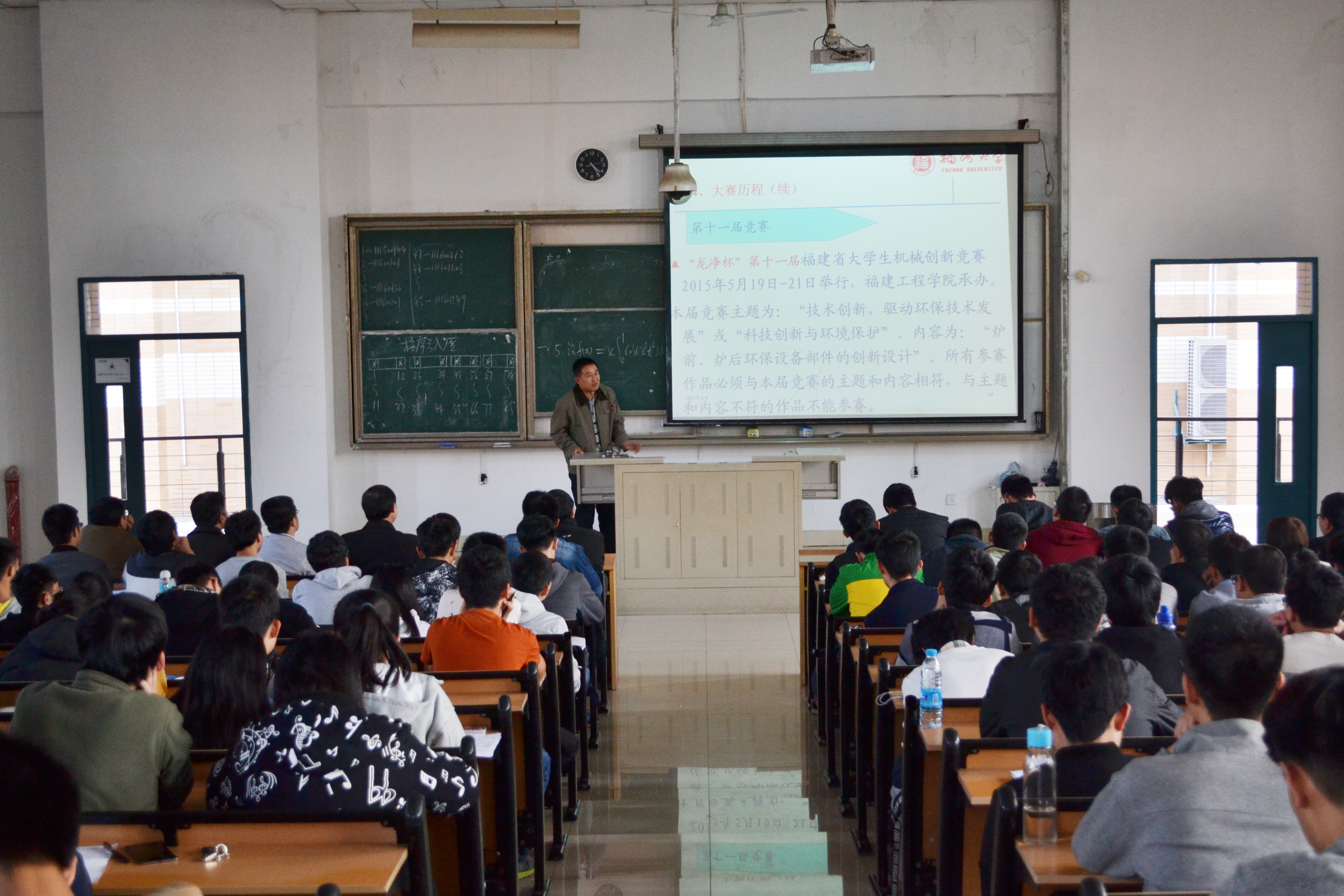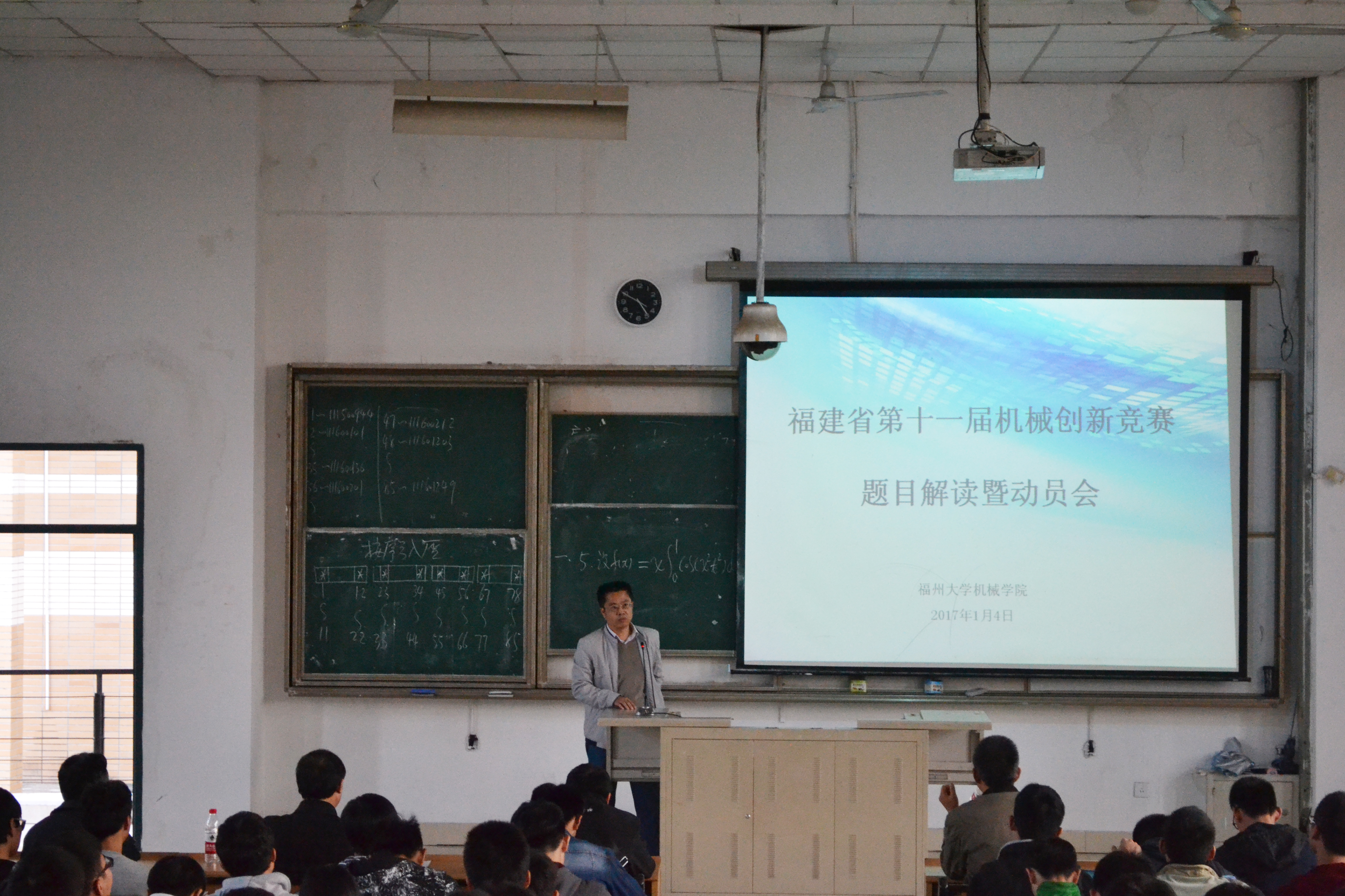 在东3-100举办了福建省第十一届机械创新竞赛题目解读暨动员会,莅临本次活动的嘉宾有刘晓敏教授、陈绍春教授、朱光宇教授、蓝兆辉教授、蔡英杰副教授、薛丁琪老师、罗君扬老师、陈宗寿老师、唐福官老师、黄敏纯老师、团委副书记刘旭莹老师、各年级辅导员以及动漫屋