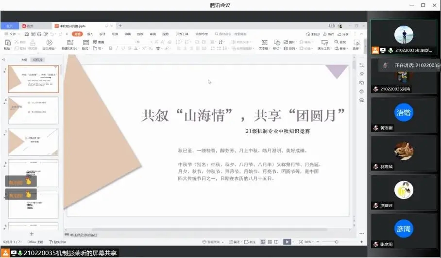 21级机械制造及自动化班级的“中秋共叙山海情,共享团圆月”中秋知识竞赛活动。