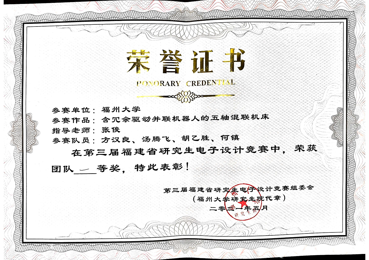 2021年5月30日,第三届福建省研究生电子设计竞赛顺利闭幕。动漫屋 张俊教授指导的《含冗余驱动并联机器人的五轴混联机床》项目获得了一等奖,参赛队员:方汉良、汤腾飞、胡乙胜、何镇。