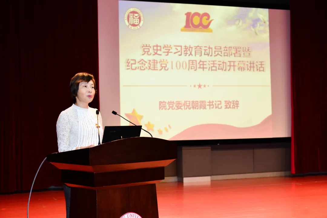 学院党委倪朝霞书记作党史学习教育动员部署暨纪念建党100周年活动开幕讲话。她强调,在全党开展党史学习教育,是党中央作出的重大决策,全体党员要以高度的政治自觉迅速行动起来,坚决贯彻党中央关于党史学习教育的决策部署以及省委、省委教育工委的工作要求,为开展好党史学习教育做好政治上、思想上、组织上的充分准备。她提出四点要求:一是提高政治站位,统一思想认识,准确把握开展党史学习教育的重大意义;二是突出学习重点,把握党史学习教育的精髓要义;三是坚持学用结合,紧扣专题学习、组织生活、研究宣传、实践活动等关键环节,推动党史学习教育有序开展;四是压实主体责任,确保党史学习教育取得实效。