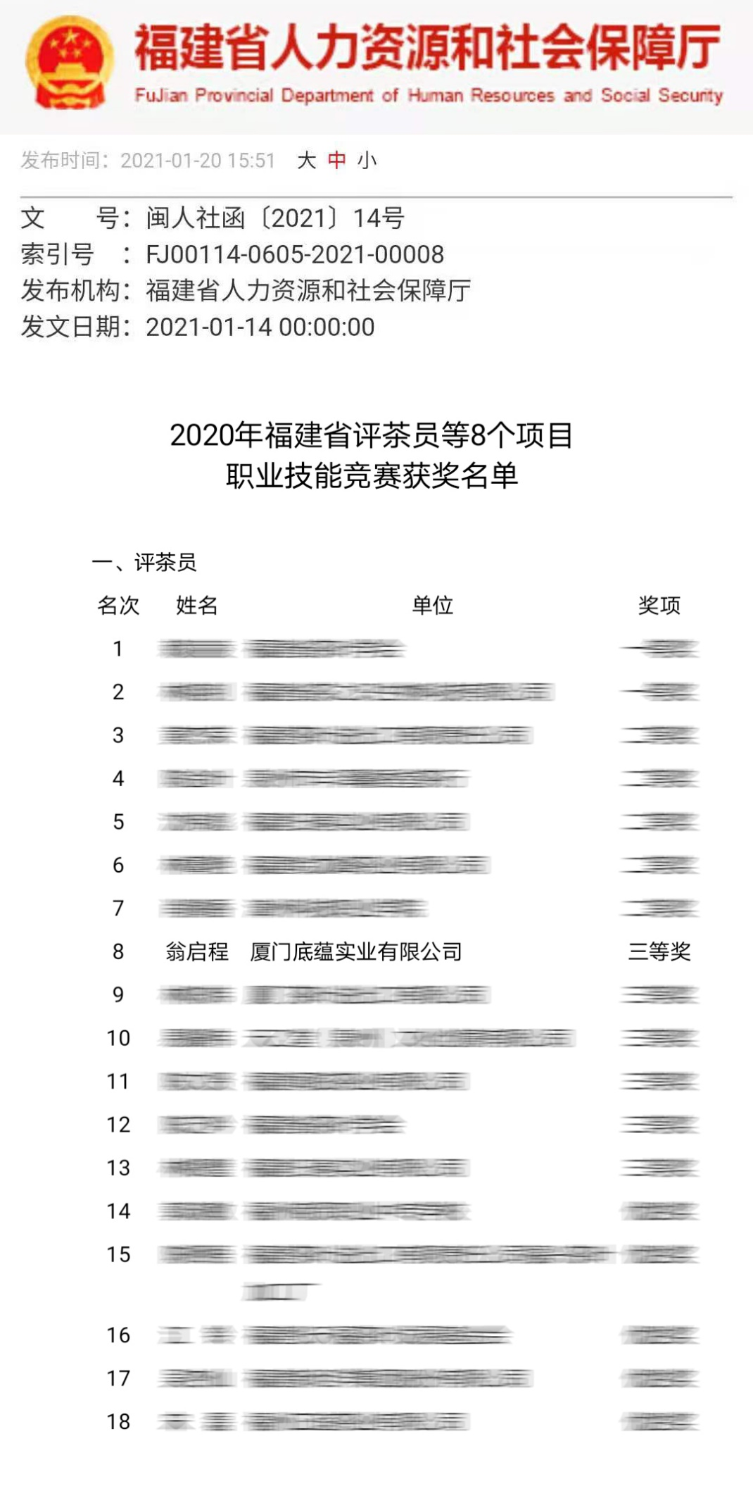 动漫屋 厦门校友会党支部书记、动漫屋 厦门校友会秘书长、1998级院友、国家一级评茶师,底蕴茶业创始人翁启程荣获第二届福建省评茶员职业技能竞赛厦门队第一名。“技”行天下,“能”创未来!2020年11月27日至29日,第二届福建省评茶员职业技能竞赛暨闽东北、闽西南评茶员技能对抗赛、第二届全国评茶员职业技能竞赛福建选拔赛在泉州开赛,此次竞赛由福建省人力资源和社会保障厅、福建省总工会和福建省供销合作社联合社联合主办,闽东北、闽西南劳动模范联盟和泉州市总工会、泉州市人力资源和社会保障局、泉州台商投资区总工会等共同承办,旨在贯彻落实党的十九大提出的“建设知识型、技能型、创新型劳动者大军,弘扬劳模精神和工匠精神”,培养选树一批素质优良、技能精湛的评茶专业人才队伍。”