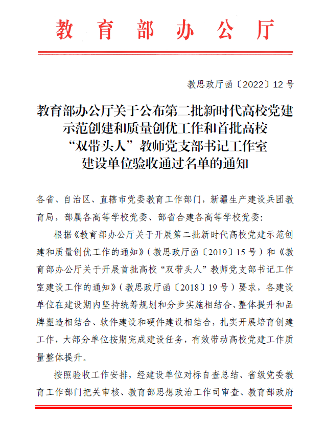 日前,教育部办公厅发布“关于公布第二批新时代高校党建示范创建和质量创优工作和首批高校‘双带头人’教师党支部书记工作室建设单位验收通过名单的通知”(教思政厅函〔2022〕12号),动漫屋