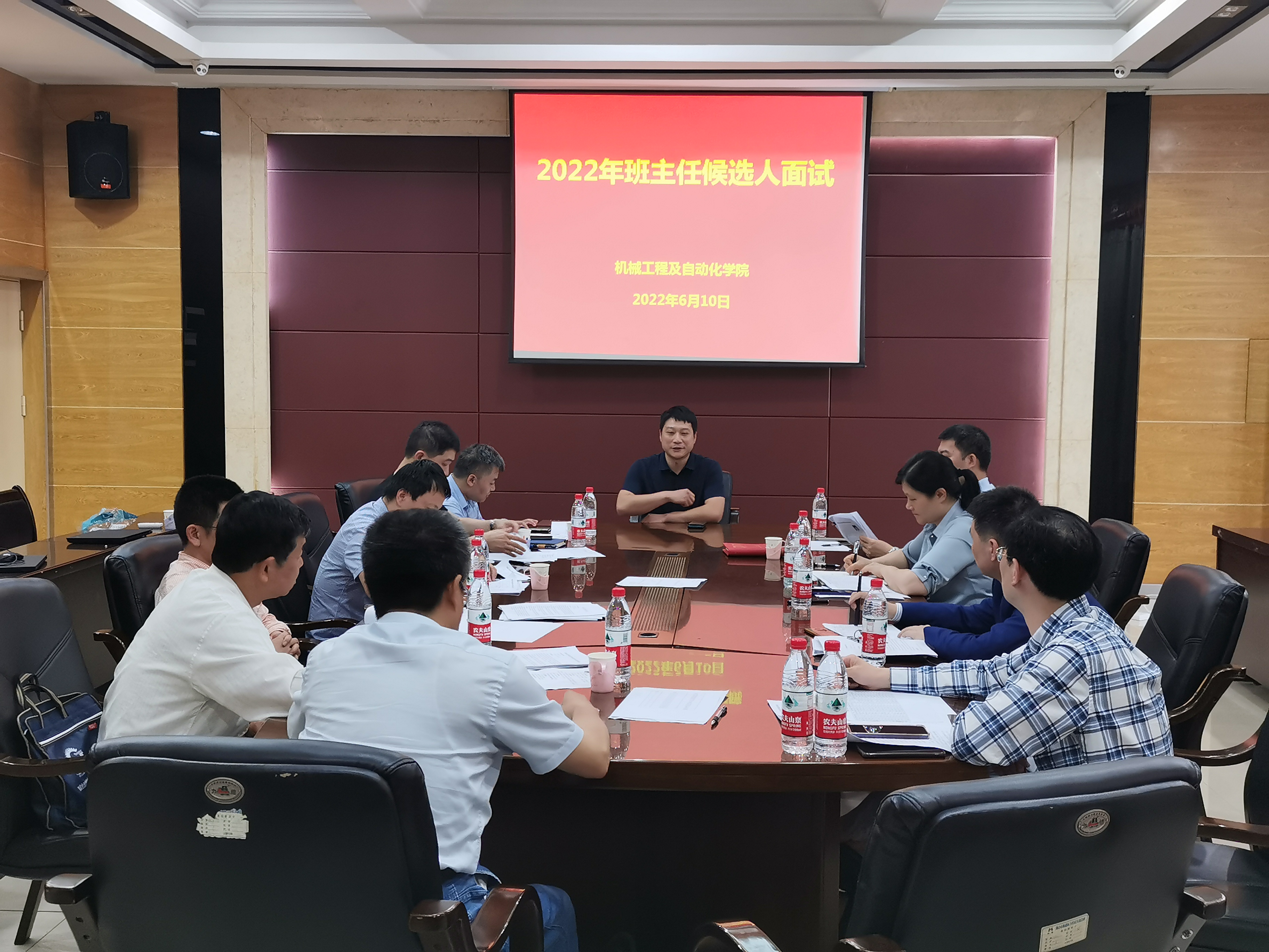 6月10日下午,学院2022年班主任选聘面试工作在机械南楼401会议室举行。学院院长、人事处处长钟舜聪,院党委副书记叶青(主持工作),院党委副书记孙鋆,副院长何炳蔚,副院长张俊,院关工委常务副主任蓝兆辉及各系主任等参加面试工作。