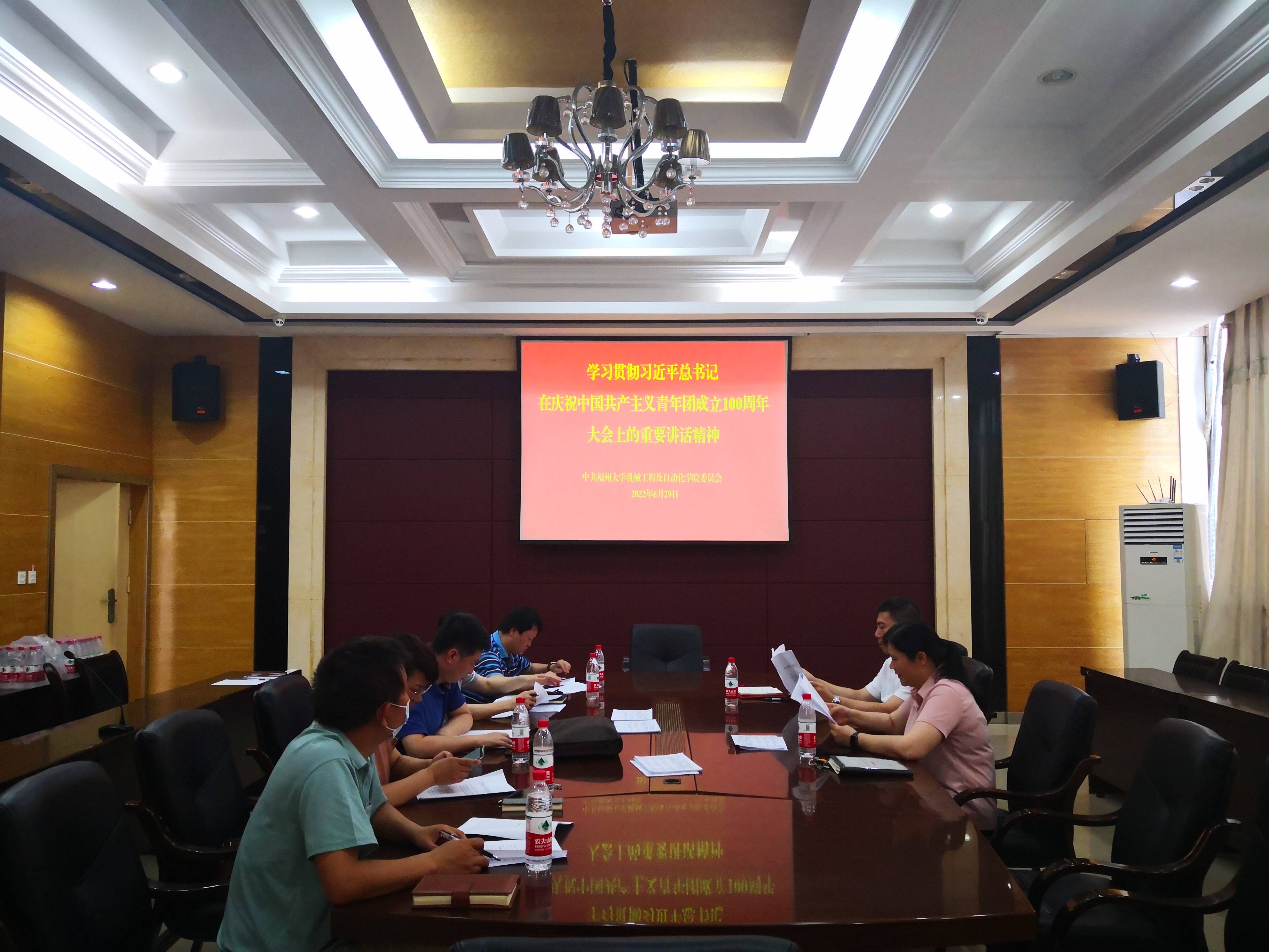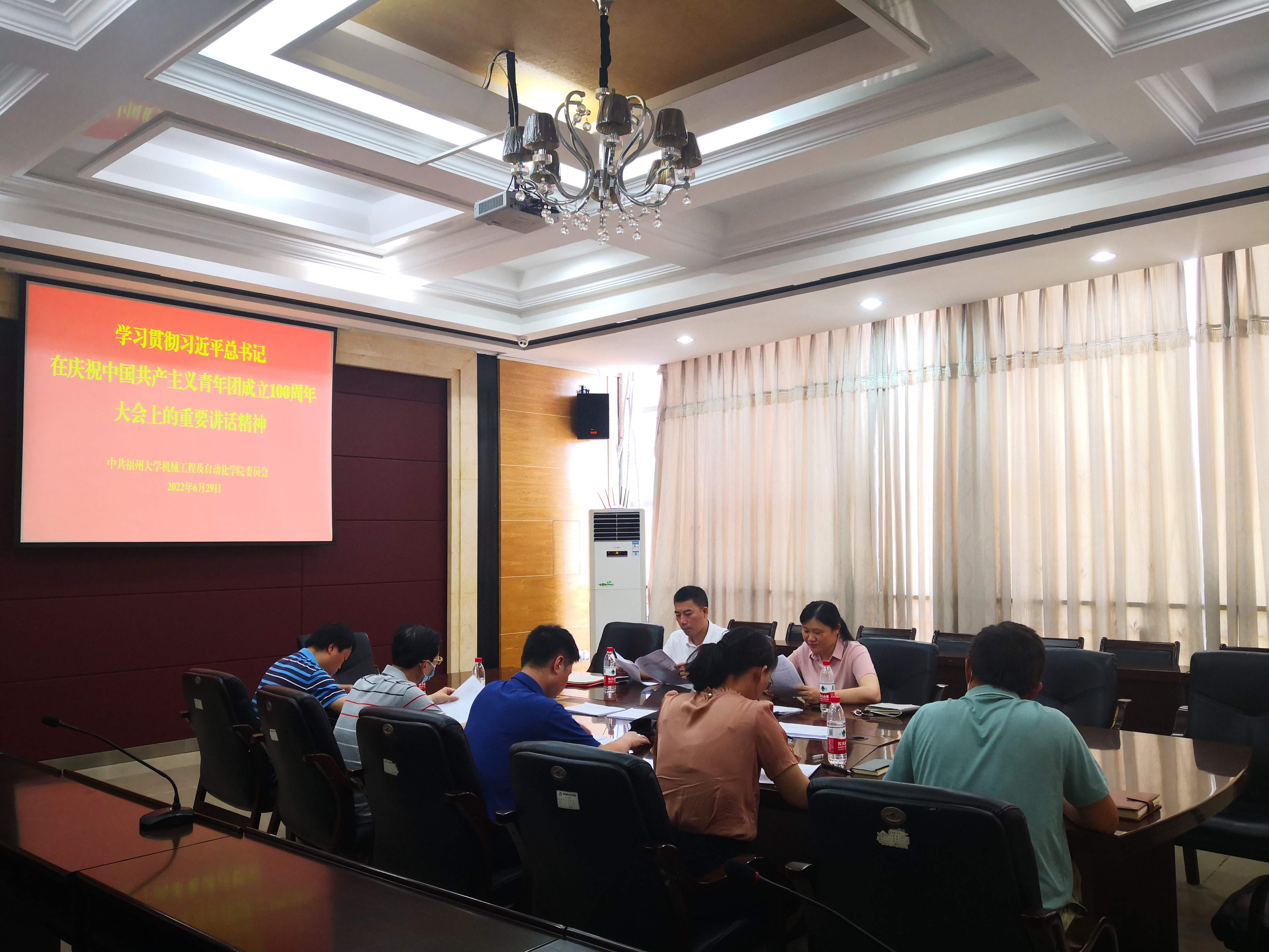 在机械楼南401会议室举办党委理论学习中心组(扩大)学习会认真学习习近平总书记在庆祝中国共产主义青年团成立100周年大会上重要讲话精神。全体党委委员和思想政治辅导员参加了学习会。
