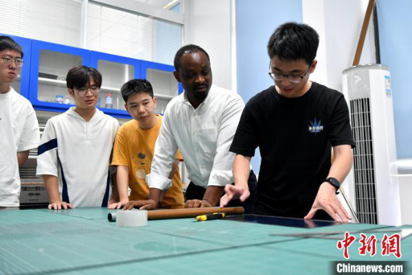 8月30日,南吉姆瓦(右二)在福州指导学生制备复合材料结构试样。 中新社记者 吕明 摄
