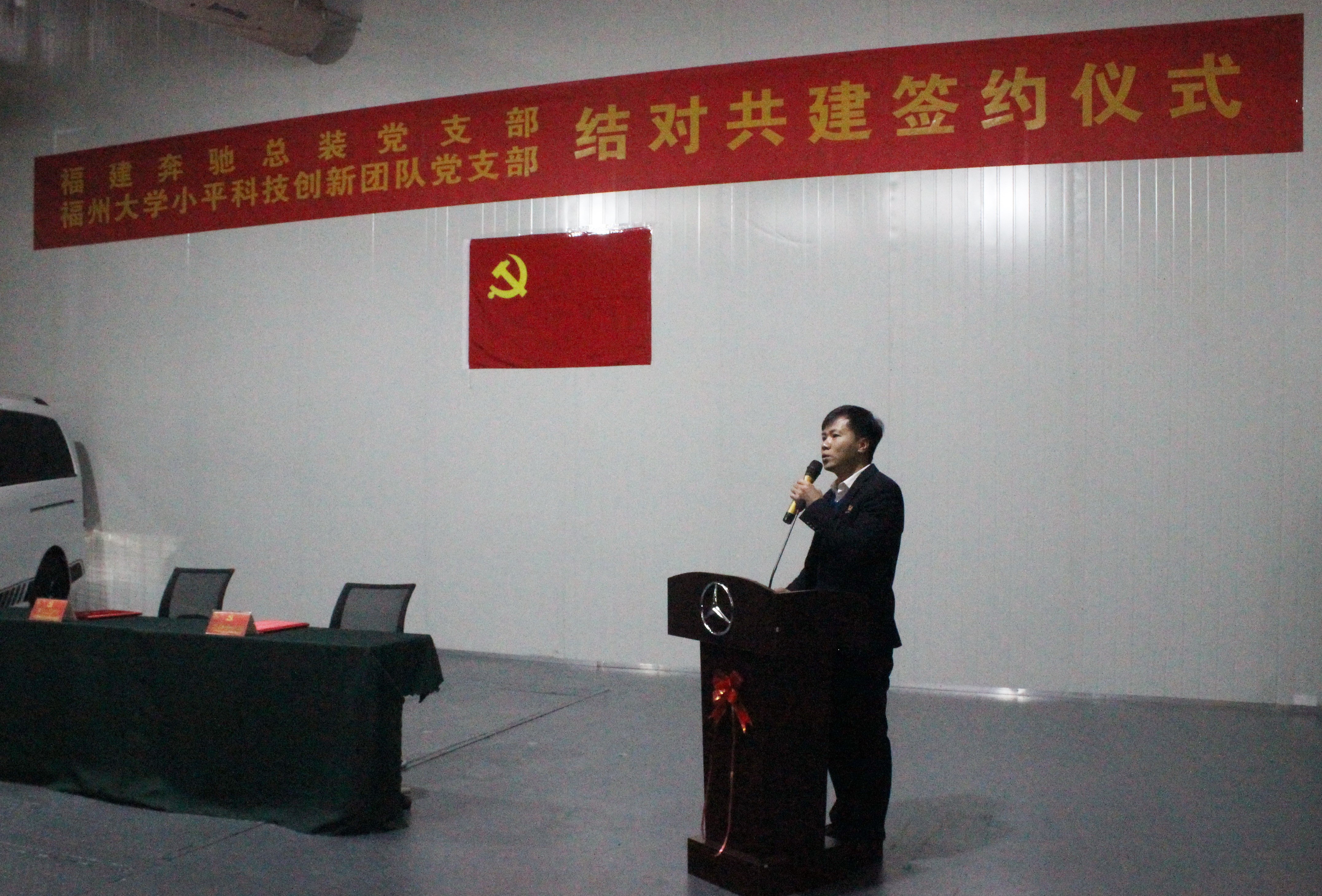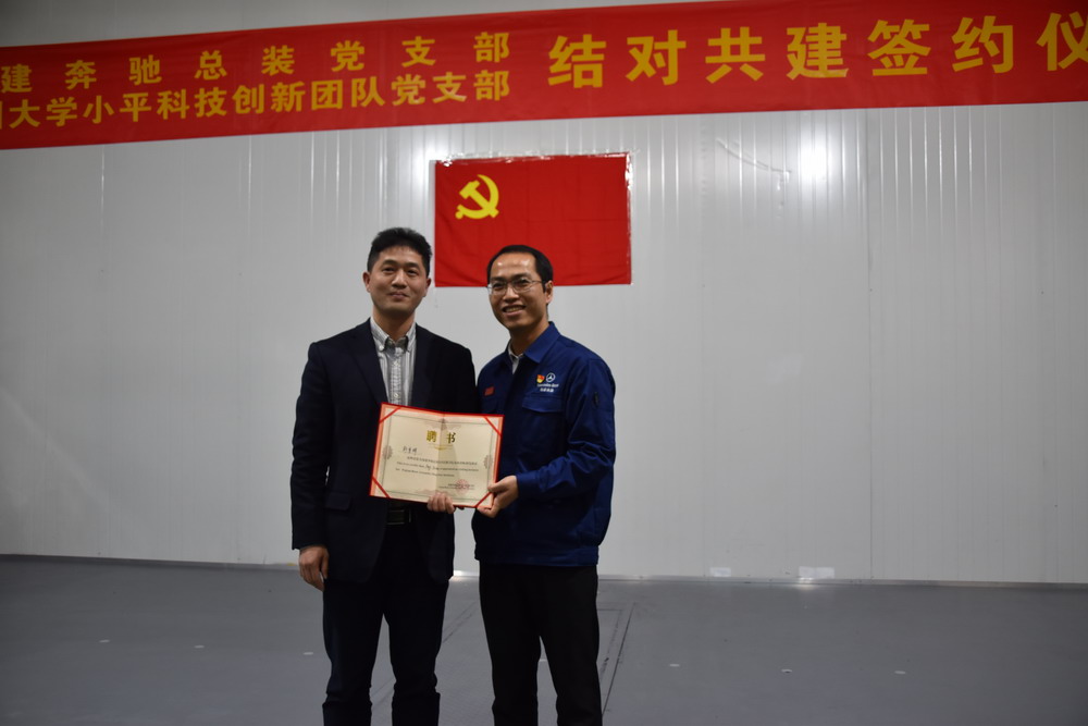 小平科技创新团队党支部书记林成金在领导和支部全体党员的见证下签署《结对共建协议书》。根据协议书内容,双方将通过共建活动平台、分享工作资源、交流工作经验、解决实际问题等途径,实现党的建设和业务工作有机融合、互相促进。福建奔驰党委委员、总装车间星徽学院院长方新为小平科技创新团队党支部党员、车辆工程系副主任彭育辉颁发“星徽学院”特聘讲师聘书。