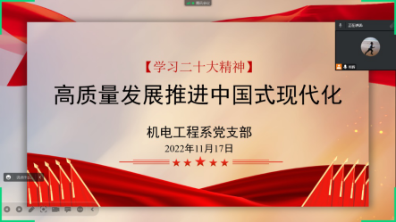 2022年11月17日下午,机电工程系党支部召开线上党员大会,以“高质量发展推进中国式现代化”为主题,集中学习二十大精神。