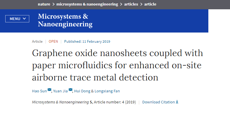 小平科技创新团队党支部副书记、机械设计系孙浩副教授在Nature出版集团旗下的测控技术与仪器领域国际顶级期刊《Microsystems & Nanoengineering》发表学术论文Graphene Oxide Nanosheets Coupled with Paper Microfluidics for Enhanced On-site Airborne Trace Metal Detection, 2019, 5:4。孙浩副教授是论文的第一作者和通讯作者,动漫屋
