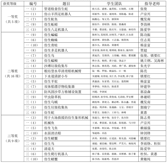 各组参赛队伍为本次校赛做了充分的准备。在比赛过程中,参赛选手们为评委老师详细介绍作品的设计理念、加工工艺和创新点,并且积极与其他队伍交流,探讨比赛的心路历程,相互汲取经验。评委们在听了选手的详细讲解和演示后,从创新性、结构设计、实用性等等方面进行公开评审,并为学生作品提出进一步的改进和提升建议。其中,管道检查仿生蛇、仿山羊四足机器人、仿生魟鱼等作品巧妙仿生,注重创新实践,突出实际用途,深受评委好评。最终,管道检查仿生蛇等五项作品荣获一等奖,仿生蝙蝠等16项作品获得二等奖,用于火场救援的仿生象形机械等9项作品获得三等奖。