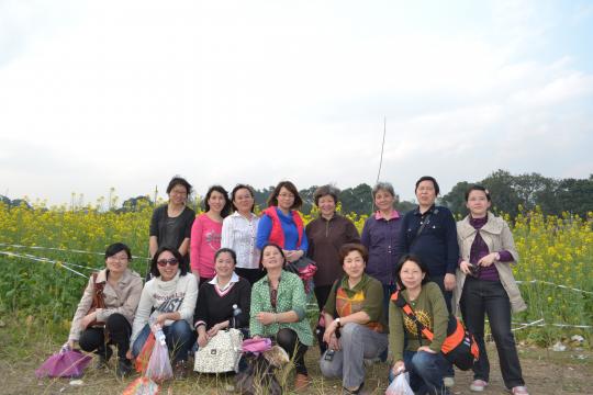 随后组织女教工观赏油菜花。在我国,油菜花观赏的时间为每年的十二月底到来年月四月。三月份正是观赏油菜花的好季节,我们步行至江边的马坑村,就看到油菜花田了。一大片油菜花陆续盛开,遍地金黄、金光闪闪。耀眼夺目的油菜花让人兴奋,微风吹来,此起彼伏,置身美丽金黄的花海,犹如画中游。观赏完油菜花,我们就搭上了回程大巴,将近下午五点到达老校区东门,结束一天令人流连忘返的行程。一天的活动丰富而精彩,不但给在职与退休女教师提供交流与沟通平台,同时让我们体验在繁忙工作之余轻松休闲的农家之乐。
