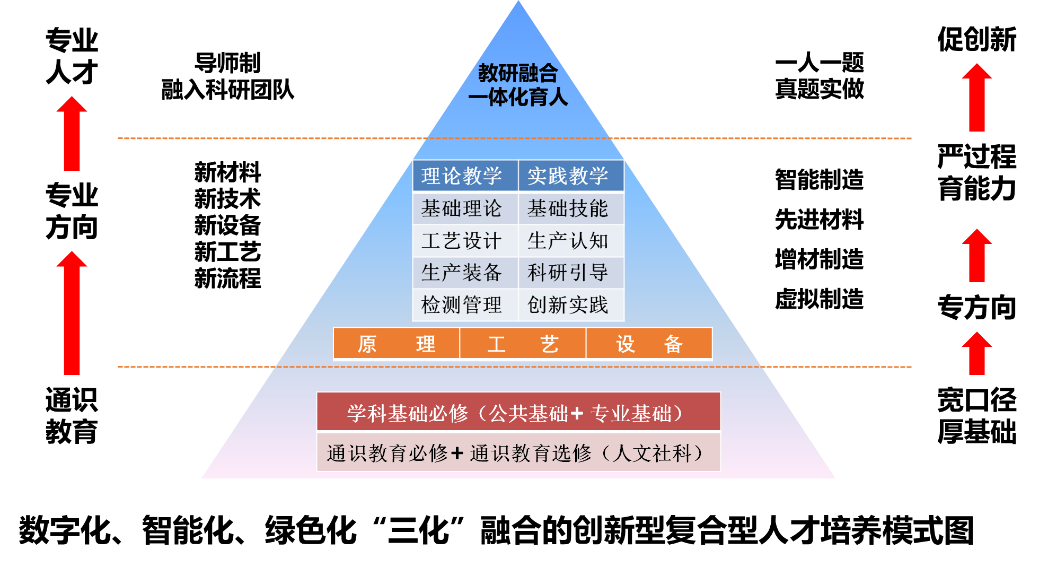 材料成型及控制工程专业实行“通识教育 + 专业方向”的培养模式,在大学一、二年级主要学习通识教育课程和学科基础课,按机械学科大类进行培养。从大学三年级开始进行专业培养,学生可根据特长及兴趣爱好来选择具体的专业方向进行个性化的培养。毕业生可到相关企业或国家机关从事科学研究、技术开发、工程应用、生产组织与管理等方面工作,也可继续攻读本专业及相关专业的硕士研究生。