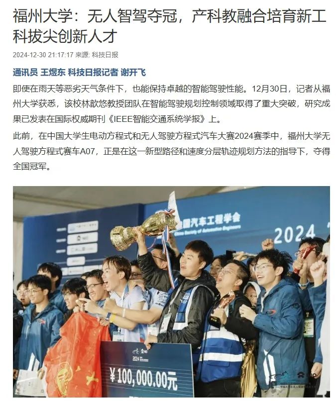学院学子问鼎2024赛季中国大学生无人驾驶方程式汽车大赛全国冠军