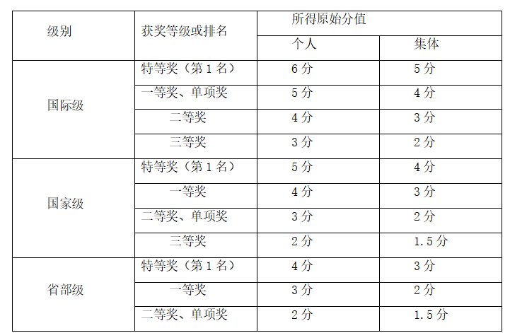备注:竞赛项目以教务处认定的为准,获奖以教务处、学生工作部(处)、团委等部门公布数据为准。团体项目获奖的,学科竞赛团队排名前3队员给予加分,按照1、0.7、0.5系数比例核算,若不分名次则所有队员平均分配分值。
