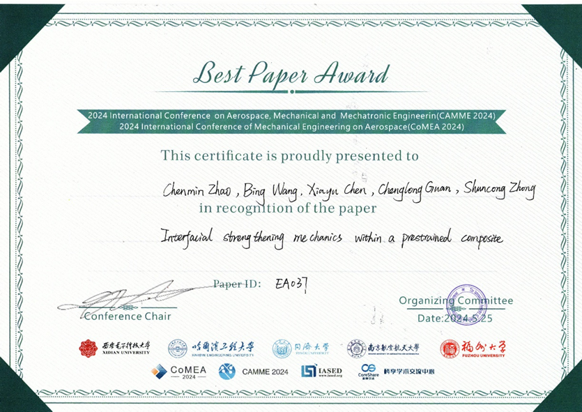 博士研究生赵陈敏题为Interfacial strengthening mechanics within a prestrained composite的论文,获大会最佳论文奖。论文主要介绍了他在纤维预应力复合材料界面增强机理方面的最新研究进展,相关研究发表SCI论文5篇,入选ESI高被引论文1篇,已授权发明专利1件。