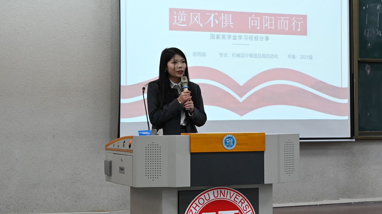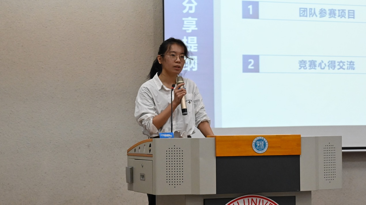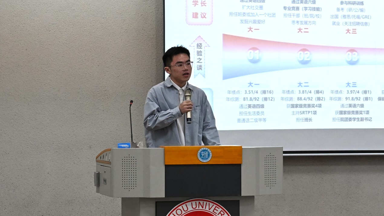会上气氛活跃,掌声雷动。“国奖达人”2024年本科生国家奖学金获得者谢雨娟、郭昇鑫,“创新之星”2023年中国国际大学生创新大赛大学生创新大赛银奖获得者吴纪衡、2024年中国国际大学生创新大赛银奖获得者庄聘婷4位优秀学生代表从学习科研、学科竞赛、学生工作、社会实践、志愿服务等角度分享他们的奋斗历程与成长故事,展现了他们勤奋刻苦、严谨务实、不怕失败、追求卓越的优秀精神品质,为同学们提供了宝贵的经验,进一步增强同学们对学习的深刻理解和对大学职业生涯规划的认知。同时,4位分享者鼓励与会学生扎根学习、躬耕实践,争做德智体美劳全面发展的时代青年。