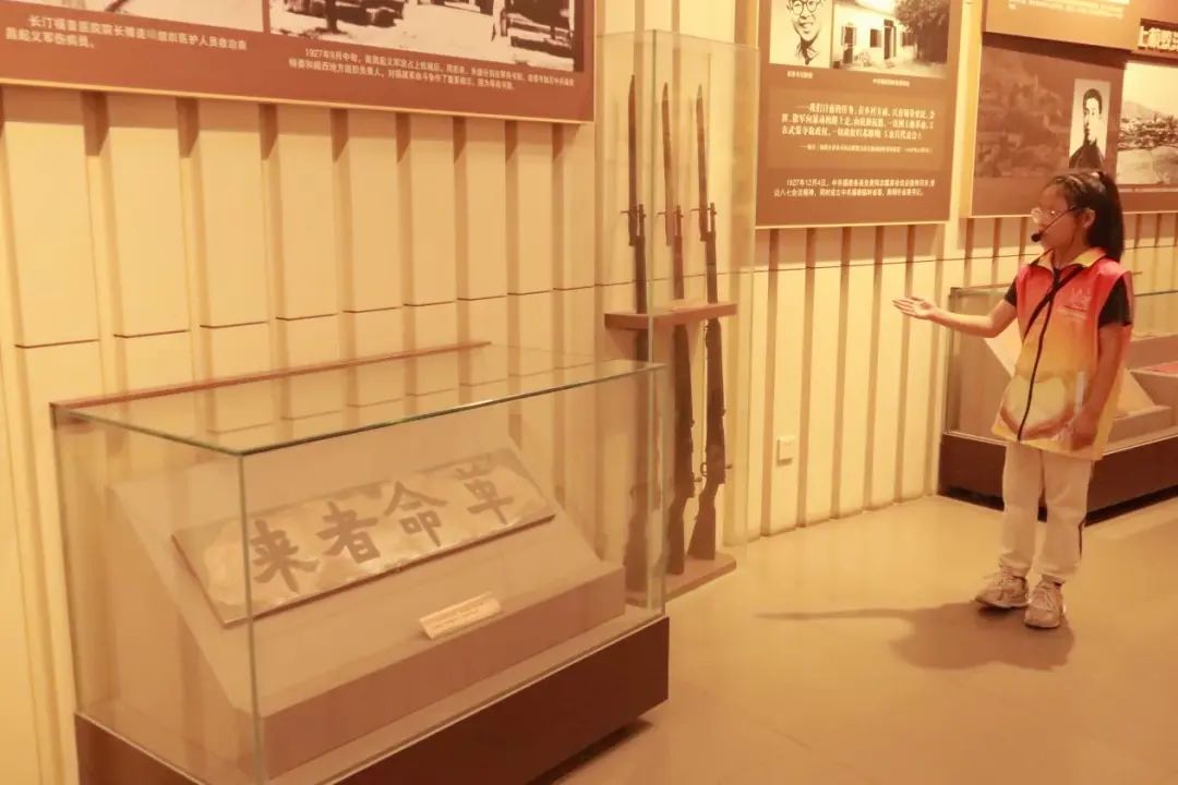 小讲解员讲解革命战争年代遗留的武器及牌匾