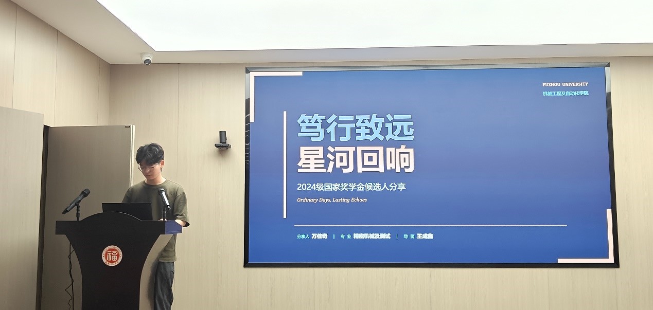 首先,万佳奇同学以“笃行致远,星河回响”为题进行分享。作为2024级精密机械及测试专业硕士研究生,万佳奇同学专注于第四代半导体材料平坦化相关研究,并已发表卓越期刊论文1篇。分享中,他结合自身科研经历,从研究方向选择、课题推进、文献阅读、实验积累等方面进行梳理,强调科研工作需要长期沉淀与持续投入。面对研究过程中的困难与不确定性,他鼓励同学们保持稳定节奏,在日常积累中不断提升科研能力,在一次次尝试与修正中实现成长突破。