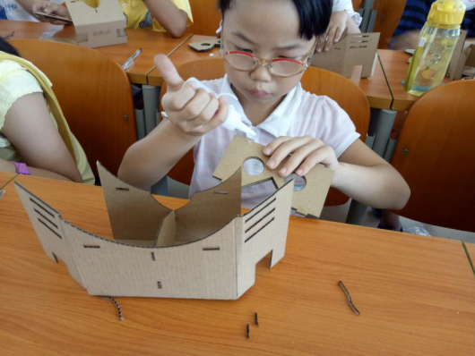 VR协会对实践队的材料支持。志愿者在孩子们身边做一个示范,孩子们就能很好地跟上节奏,不需要手把手地教,真正是孩子们自己在不断尝试与探索。