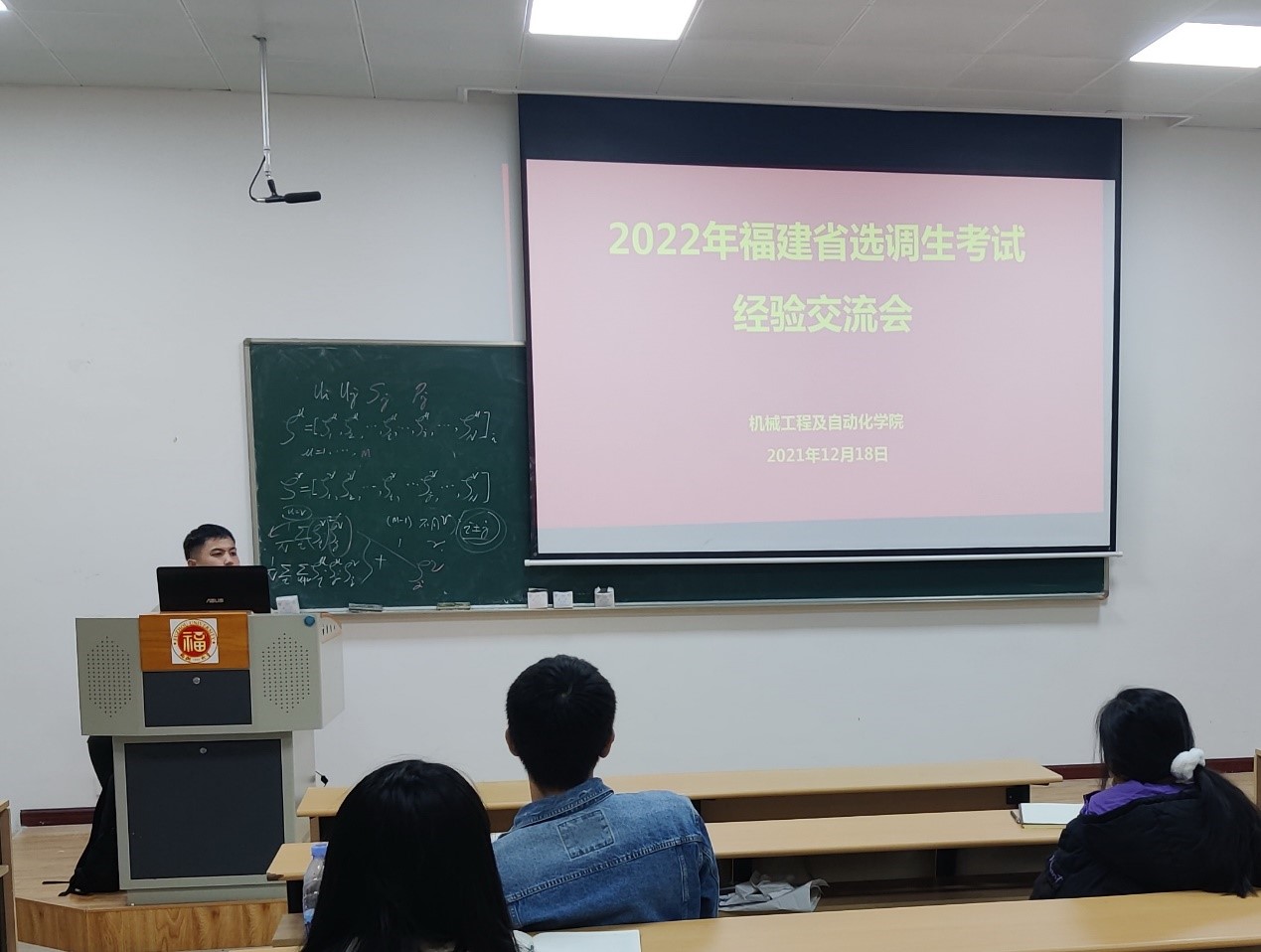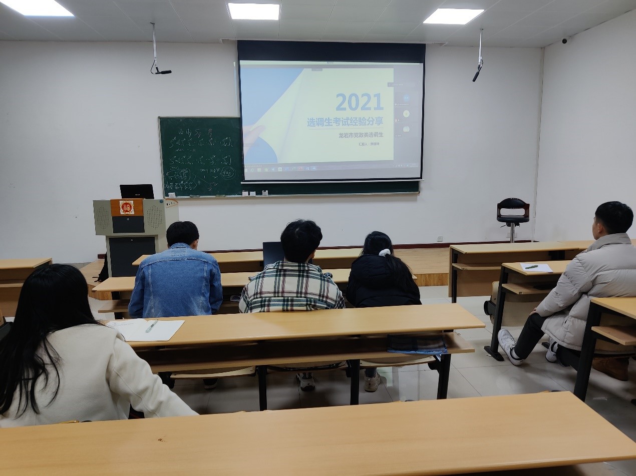 2022年福建省选调生候选人做好备考准备,12月18日晚,学院通过线上线下结合的形式在机械南201举办2022年福建省选调生考试经验交流会。活动邀请了学院2021年福建省选调生黄国辉、黄银坤分享备考经验,学院报考2022年福建省选调生的本科生、研究生22人参加会议。