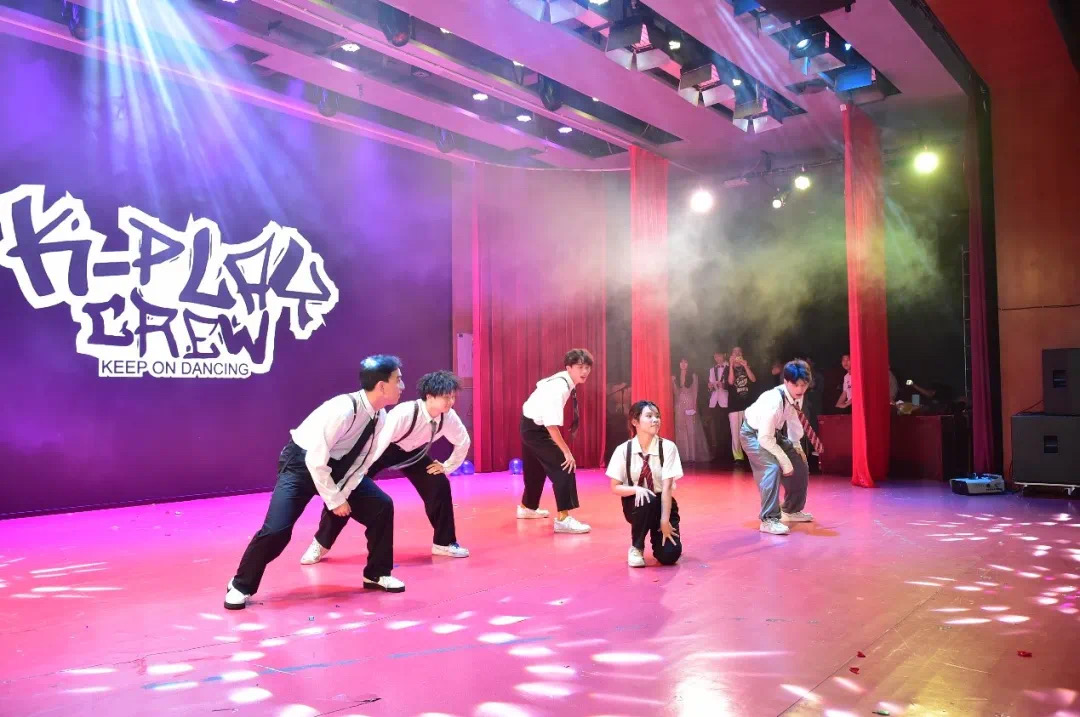 街舞《Uptown Funk》。音乐响起,有力的节拍充斥着整个舞台上下,酷玩街舞协会的舞者们在明灭的灯光、喷洒的雾气中挥洒属于青春的热情,令人炫目的舞姿总能引得台下观众尖叫不断。