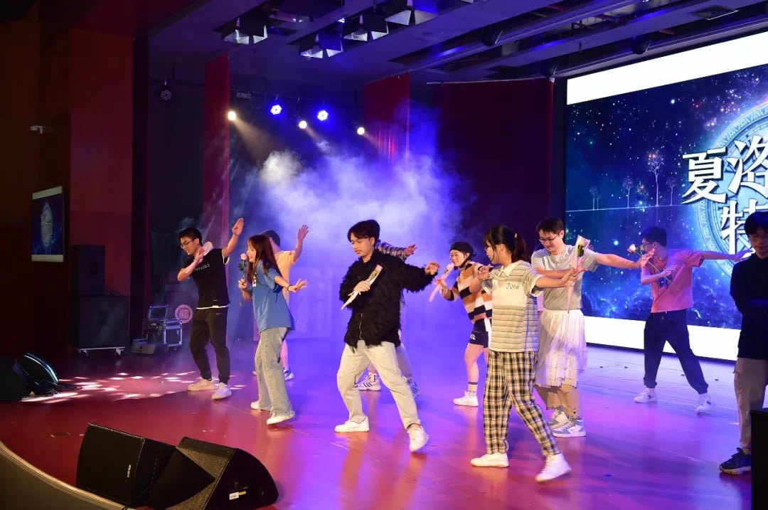 晚会正式开始,随着灯光聚焦到舞台的中央,来自材控班级的《离开地球表面》+《干杯》将整个舞台直接点燃,全场气氛跟着主唱一般,越跳越高把地球甩掉,这也让我们对接下来的晚会节目更加期待。