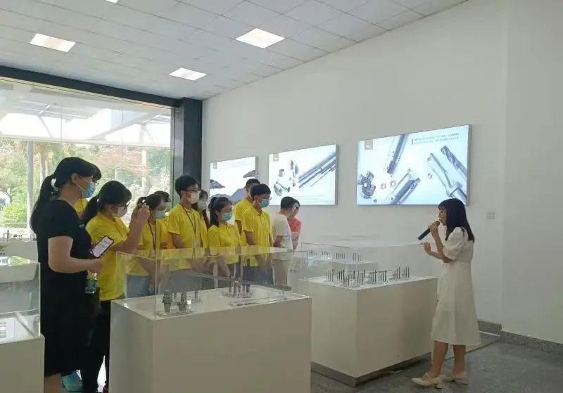 各领导与实践队成员在工作人员的带领下参观了厦门金鹭科技展厅和生产车间。叶书记一行先后前往整硬刀具、可转位刀具、PCB微型刀具车间参观,近距离观看生产设备,深入了解生产工艺、制造流程和现场管理。