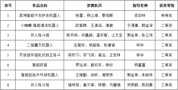 李劲林老师指导,本科生张震、杨江湖、蔡翎辉制作的参赛作品“家用智能干发护发机器人”荣获特等奖,该作品所在赛项在本届大赛全国决赛一共颁发了197项奖项,特等奖仅6项。