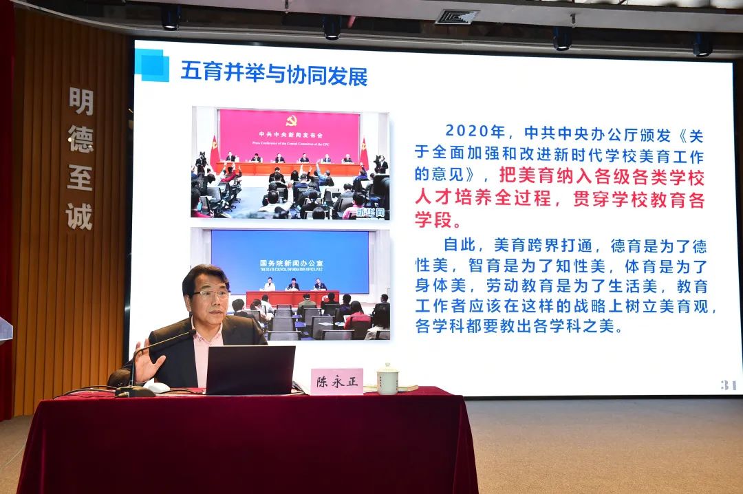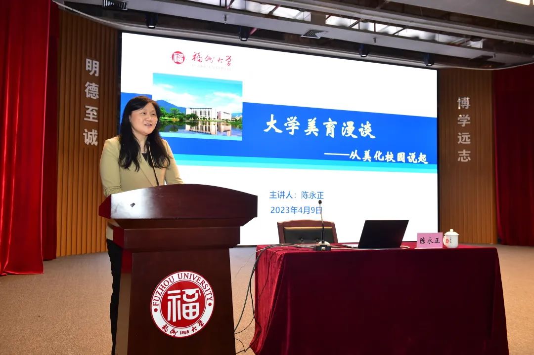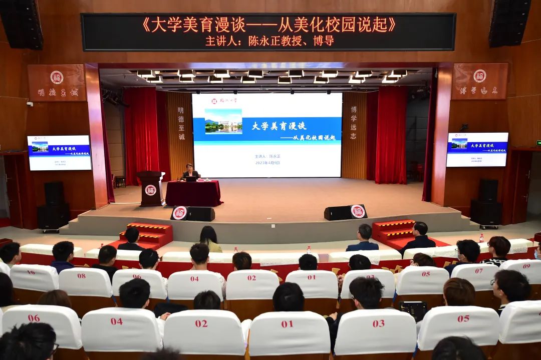 美丽而独特的山水校园景观开始,结合世界知名大学的优美校园环境,深入阐述大学校园作为美育的重要载体对净化人的心灵、塑造美好人格的良好作用。陈教授阐述了马克思主义关于美的本质的论述,梳理了党的十八大以来党和国家关于美育工作的要求,强调了美育对促进大学生全面发展的重要作用。他从山水生态之美、现代科技之美、人文关怀之美、捐建共建之美等角度,深入解读了旗山校区山水校园自然景观和亭台楼阁等人文景观所蕴含的精神内涵,引导和鼓励学院师生要善于在日常学习、生活和工作中发现美、欣赏美、创造美。陈教授深入浅出、生动活泼的讲授,让与会师生们仿佛享受了一场“美”的思想和精神盛宴,赢得了老师和同学们的阵阵掌声。