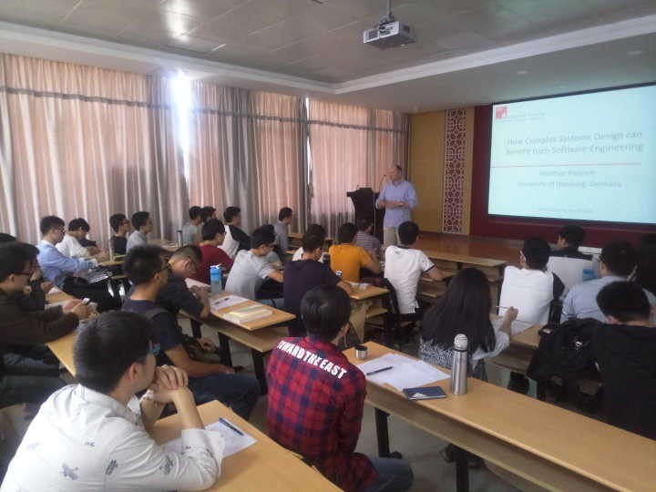 报告的开始由何炳蔚老师对Matthias Riebisch教授做了一个简短的介绍,紧接着Matthias Riebisch教授介绍了德国汉堡大学的概况:学校所在的城市、周围的环境情况,并对学校周围的交通状况进行大体的叙述,以及汉堡大学的学习模式、学习过程和学分课时的设置,让同学们有初步的了解。其后Matthias Riebisch教授对自己的报告主题做了详细的阐述,主要讲解如何设计一个工程软件解决现实中针对不同工程系统的应用。在ppt展示到北京地铁的地下交通网络时,教授提问同学们可以从中得到什么信息,经过相互之间短暂的交流,教授指出目前一些管理系统都比较复杂,所以一旦出现问题会很难处理。而目前他在做的这个自动化的计算机软件系统可在复杂的管理系统中起到良好的作用。在结束本次学术报告之前,同学们纷纷就自己比较关注的问题与教授进行了交流,Matthias Riebisch教授对每个问题都进行了耐心细致的解答。