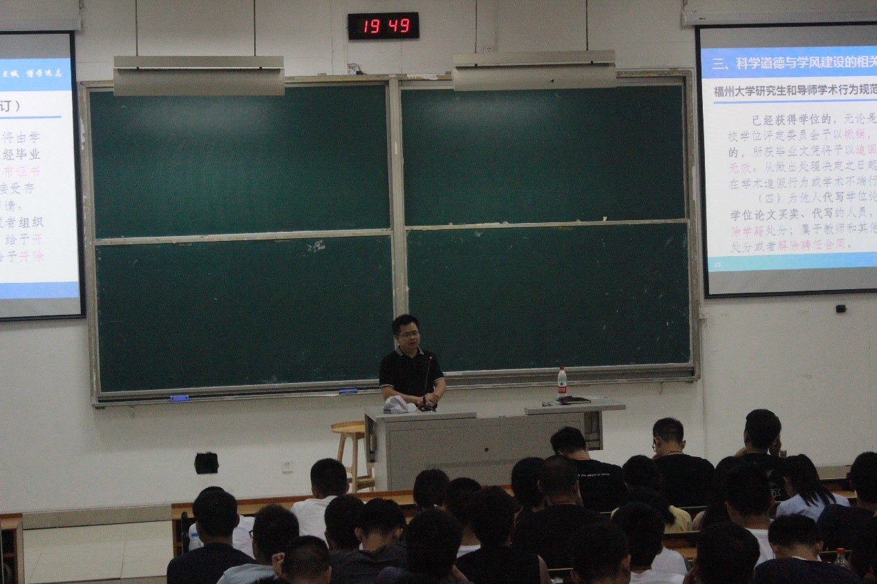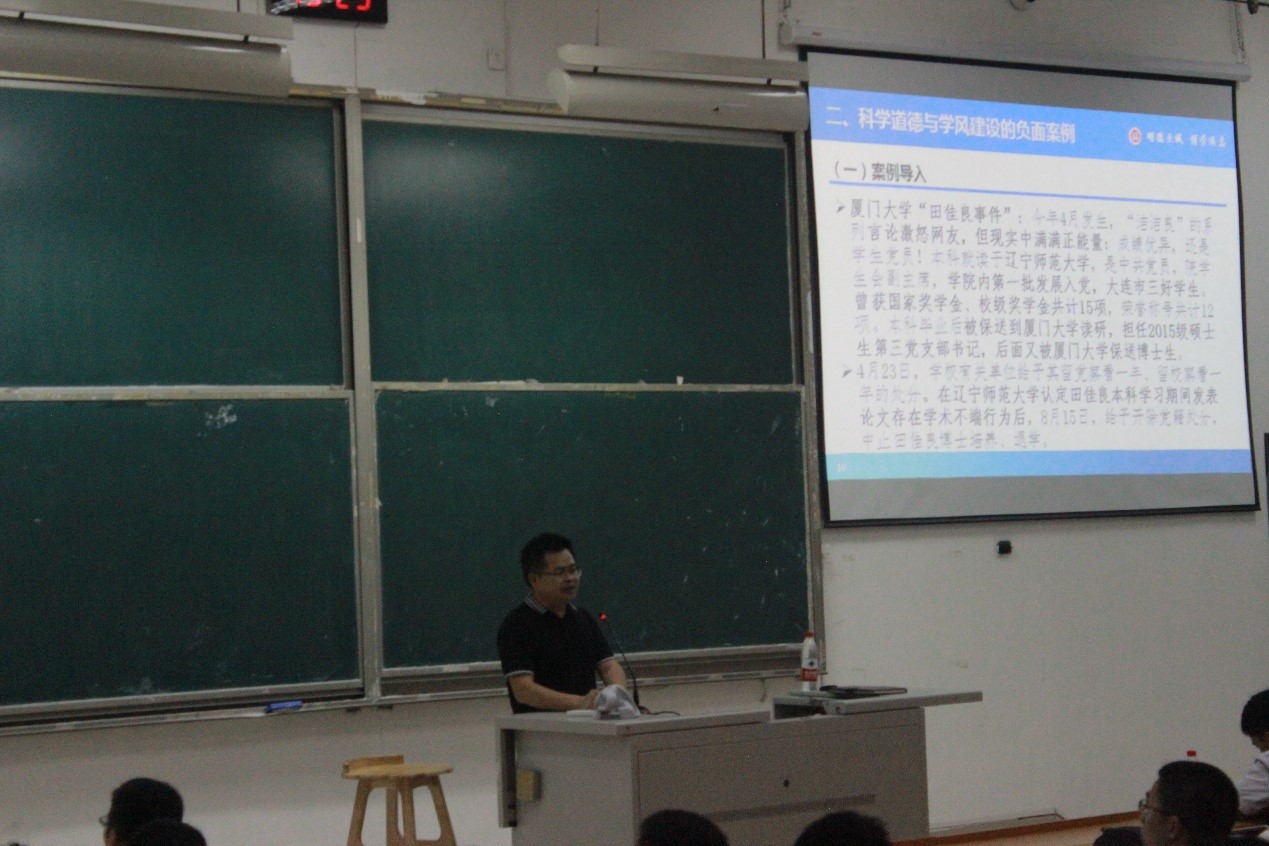 为引导新入学研究生树立端正的学术品行、了解学术不端的来源及危害,我学院于9月7日晚19:00在文3-101开展了关于“科学道德与学风建设”专题讲座活动,活动由学院2018级研究生辅导员林成金老师主持,校学生工作部(处)刘有升教授主讲。