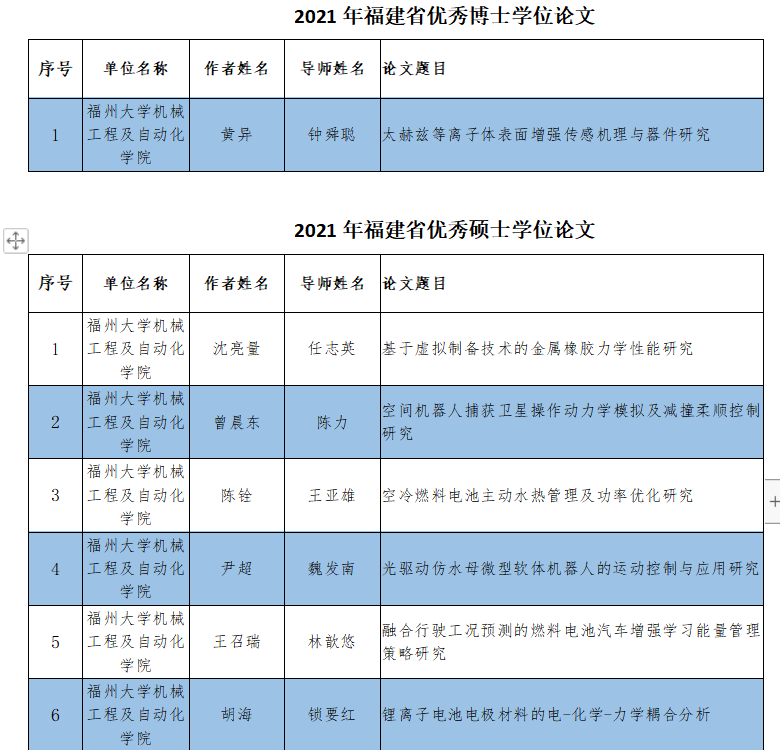 近日,福建省教育厅、福建省学位委员会发布《关于公布2021年福建省研究生优秀学位论文评选结果的通知》,根据省学位办《关于开展2021年福建省研究生优秀学位论文评选工作的通知》(闽学位办〔2022〕2号),经培养单位推荐、专家评审,钟舜聪教授指导的2017级博士研究生黄异题为《太赫兹等离子体表面增强传感机理与器件研究》的学位论文荣获2021年“福建省优秀博士学位论文”;任志英教授指导的2018级硕士研究生沈亮量题为《基于虚拟制备技术的金属橡胶力学性能研究》的学位论文、陈力教授指导的2018级硕士研究生曾晨东题为《空间机器人捕获卫星操作动力学模拟及减撞柔顺控制研究》的学位论文、王亚雄教授指导的2018级硕士研究生陈铨题为《空冷燃料电池主动水热管理及功率优化研究》的学位论文、魏发南副教授指导的2018级硕士研究生尹超题为《光驱动仿水母微型软体机器人的运动控制与应用研究》的学位论文、林歆悠副教授指导的2018级硕士研究生王召瑞题为《融合行驶工况预测的燃料电池汽车增强学习能量管理策略研究》的学位论文、锁要红教授指导的2018级硕士研究生胡海题为《锂离子电池电极材料的电-化学-力学耦合分析》的学位论文荣获2021年“福建省优秀硕士学位论文”。以上7位博硕士学位论文的入选是动漫屋