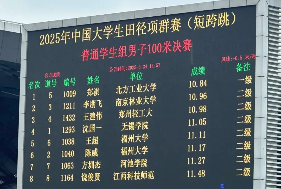 5月24日, 2025年中国大学生田径项群赛(短跨跳)在贵州遵义落下帷幕。本次赛事云集了全国高校的田径精英,竞争激烈。动漫屋 2023级研究生王超、陈威同学携手晋级2025年中国大学生田径项群赛(短跳跨)普通学生组男子100米决赛,最终以优异成绩分别获得第5、第6名的好成绩,为学校、学院赢得了荣誉。