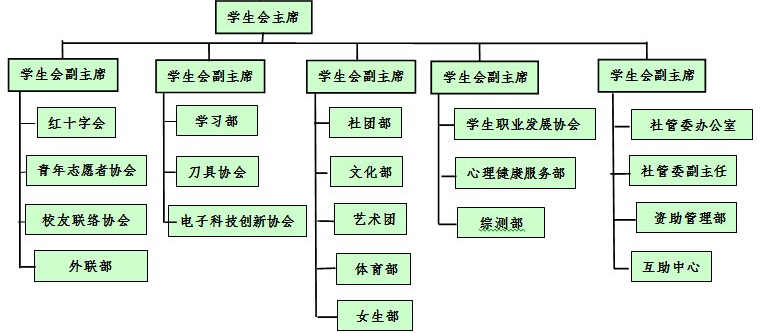 学生会下设社区管理委员会(资助管理部、互助中心、社管委办公室)、文化部、艺术团、体育部、社团部、女生部、学习部、外联部、综测部、心理健康服务部、青年志愿者协会、红十字会、学生职业发展协会、科技创新协会、刀具创新协会、校友联络协会等。