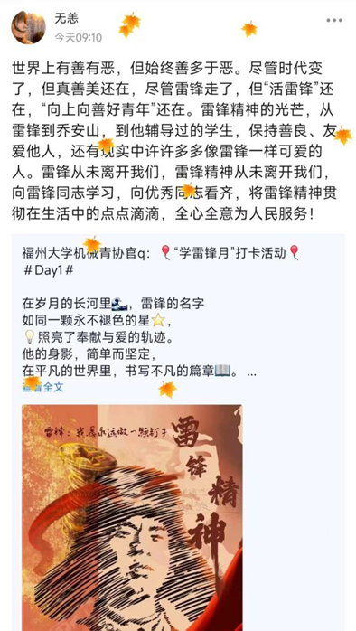 3月14日至20日,为普及雷锋知识、雷锋事迹,在全院营造助人为乐的良好氛围,学院开展7日雷锋知识学习打卡活动,学生积极参与并分享学习感悟。活动丰富了大家对雷锋精神内涵的了解,激励了机械学子积极学习“钉子精神”,争做向上向善好青年。