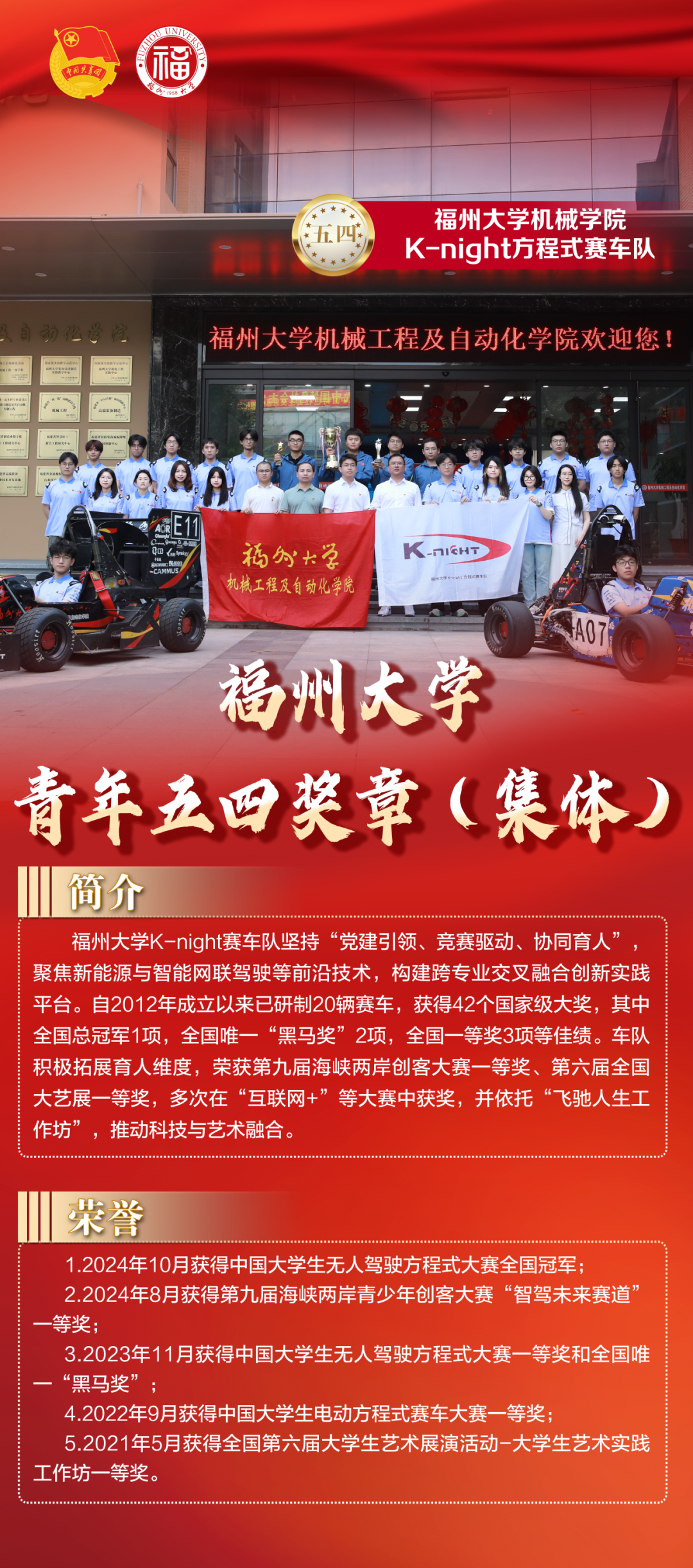 在深化高等教育综合改革与科技自立自强的时代交响中,动漫屋 K-night方程式赛车队以卓越创新实践与育人成效,从众多优秀集体中脱颖而出,荣膺2024年度动漫屋 青年五四奖章。这支团队以青春作燃料、以奋斗为引擎,将五四精神镌刻于科技创新的丰碑,为新时代青年树立起“敢为人先、勇攀高峰”的先锋标杆。